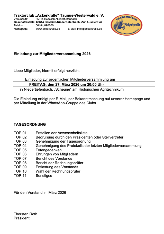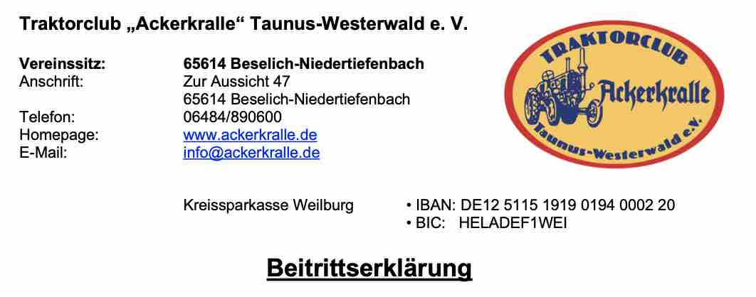 Der Traktorclub „Ackerkralle“ Taunus-Westerwald e.V. beteiligt sich an historischen Umzügen und Ausstellungen. Er veranstaltet selbst eigene Feste verschiedener Art und steht in freundschaftlichem Kontakt zu anderen Vereinen mit ähnlicher Zielsetzung. Auf überregionalen jährlichen Traktortreffen werden diese Kontakte vertieft, und es werden Erfahrungen ausgetauscht. Die Mitglieder, welche z.T. über jahrelange Restaurierungspraxis verfügen, beraten sich gegenseitig in technischer Hinsicht sowie bei der Zulassung der Traktorveteranen.